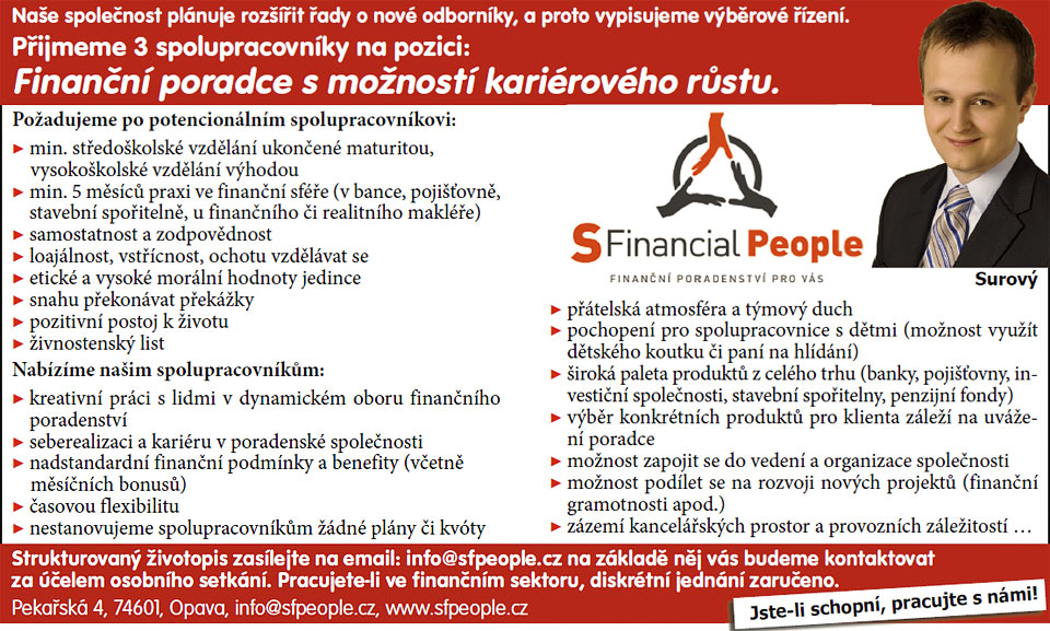 Naše společnost plánuje rozšířit řady o nové odborníky, a proto vypisujeme výběrové řízení. Přijmeme 3 spolupracovníky na pozici: Finanční poradce s možností kariérového růstu...